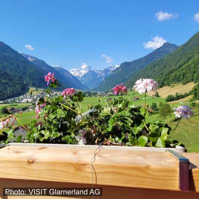 Beim Stellplatz von Familie Luchsinger kann man mit dem Zelt oder mit einem Bus einen Platz belegen. Das Ambiente ist ruhig, aber nahe beim Dorf Schwanden mit freier Sicht auf den Glarner Hausberg, den Tödi.