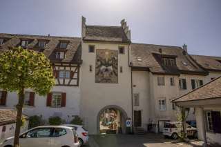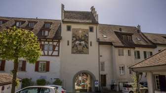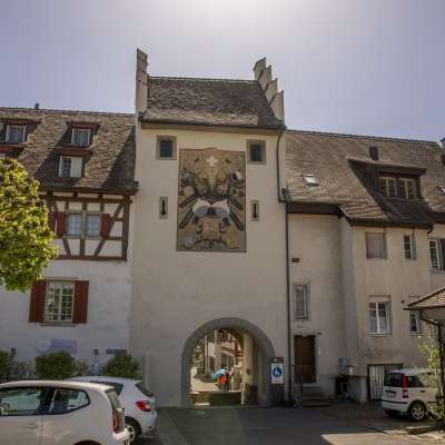 Bereits 1363 bezeugt. Beim Stadtbrand von 1668 völlig ausgebrannt. 1723 gründlich überholt. Fresko 1879 von Prof. F. Vetter aufgemalt zur Rettung des Turms. Im 19. Jahrhundert Stadtgefängnis.