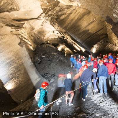 Ein Erlebnis ist die Besichtigung und Führung im Landesplattenberg Engi, dem alten Schieferbergwerk im Sernftal. Lass dich bezaubern von den gigantischen unterirdischen Hallen und der magischen Stimmung im Innern des Berges.