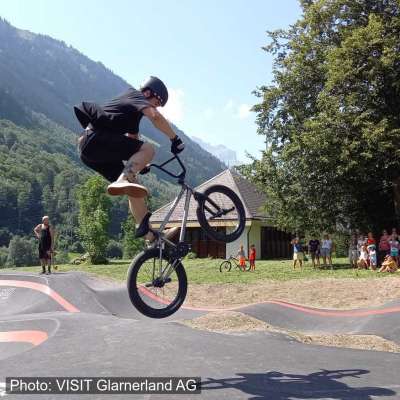 Der Pumptrack in Engi ist ein Rundparcours aus Beton, geeignet für Fahrräder, Skateboards, Rollerblades oder Trottinetts.
