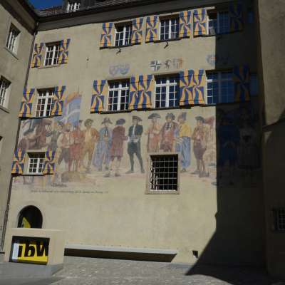 Dreigeschossiger Bau zwischen achteckigem Treppenturm und Südwest Flügel unter Walmdach mit zwei Dachgauben. 1589 zur heutigen Gestalt umgebaut. «Nütze die Zeit» steht unter dem Turm Zifferblatt. Instandstellung nach Bränden von 1622 und 1720. Turm erhielt nach 1720 Kuppelhaube mit Laterne. 1923 zur heutigen Form umgebaut. Ein patriotisches Bild schmückt seit 1930 die Fassade.