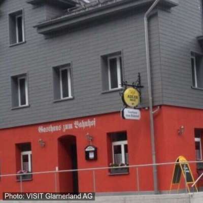 In den Farben Rot und Grau erstrahlt das Gasthaus entsprechend ihres Nachbars, der Autobetriebe Sernftal. Das Gasthaus befindet sich denn direkt gegenüber dem Bahnhofsgebäude, wo einst die Sernftalbahn Halt machte. Im Interieur ist es gemütlich mit dem altem Holztäfer und dem neueren Holzboden. 30 Sitzplätze für Wanderer, Kletterer vom Aatereistei, Golfer, Radler und viele andere stehen zur Verfügung. Tipp des Hauses: Kleine Karte, Menüs auf Vorbestellung.