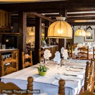 Das rustikale Riegelhaus in Ermatingen bietet eine herrliche Aussicht über den Untersee. Das Küchenteam verwöhnt die Gäste mit einem grossen Angebot an Fischspezialitäten