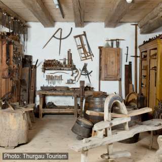Im Kornhaus des ehemaligen Dominikanerinnenklosters wird eine überwältigende Vielfalt von über 10'000 Objekten ausgestellt. Auf eindrückliche Weise werden Besuchende hier Zeuge der Lebens- und Arbeitsweise zu Urgrossmutters Zeit. Auf 2'700 Quadratmetern heisst es Eintauchen in die Welt unserer Vorfahren. Was bewegte Pferdebesitzer dazu, ein Stück graviertes Hirschgeweih an ihr Fuhrwerk zu hängen? Weshalb wurde ein Scherenmotiv in einen Dachziegel gedrückt? Auf geführten Touren erfahren Besuchende faszinierende Geschichten aus einer Zeit ohne Rasenroboter, Induktionsherd und Mobiltelefon. Darüber hinaus bestaunen sie auch das grösste historische Holzfass der Schweiz, ein 45'000 Liter-Gigant von 1759 aus Mostindien.