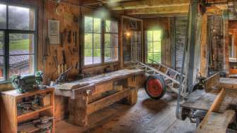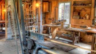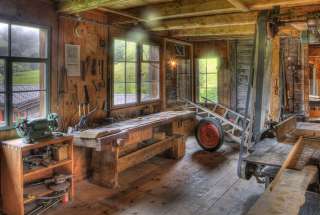 Sämtliche Werkzeuge, die einzigartigen und speziellen Gerätschaften und die mit Transmissionsriemen angetriebenen Maschinen sind noch vorhanden und vollkommen funktionstüchtig. Schieferstaub, Sägemehl und Leimgeruch durchziehen die Fabrikationsräume.