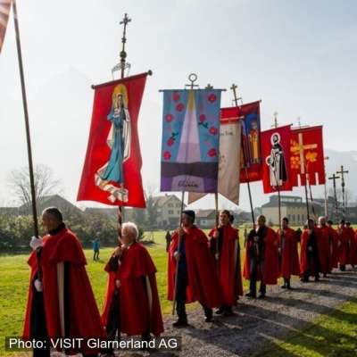 An der Landsgemeinde 1387 hatten sich die Glarner eine Verfassung gegeben, welche die Loslösung von der fremden Herrschaft beinhaltete. Die Habsburger liessen sich dies nicht gefallen und überfielen im April 1388 die Glarner. Unterstützt von einigen Urnern und Schwyzern konterten die Glarner den Angriff am Rautiberg in Näfels mit einem Steinhagel. Sie nutzten die Verwirrung und trieben das mehrfach überlegene Heer in die Flucht. Die Näfelser Fahrt gilt im Glarnerland als höchster Feiertag. Fahrtsfeier Der Ablauf des kantonalen Feiertages «Näfelser Fahrt» geht auf einen Landsgemeindebeschluss von 1835 zurück. Am ersten Donnerstag im April (ausser er falle in die Karwoche), ziehen um 7.15 Uhr vom Zeughaus Glarus militärische Ehrenformation, Harmoniemusik, Tambouren, Glarner Kantonaler Gesangverein und manche Glarner und Glarnerinnen Richtung Näfels. Gleichzeitig begibt sich die katholische Prozession, angeführt von Kreuz- und Fahnenträgern, von der St. Fridolins Kirche Glarus aus nach Näfels, wo sich die beiden Züge im Schneisingen mit den Unterländern vereinigen. Dort, beim ersten Gedenkstein, nimmt die Feier nach dem Eintreffen der Regierung ihren hochoffiziellen Anfang mit der von Musik und Gesang umrahmten Rede des Landammanns oder Landesstatthalters. Danach begibt sich der Festzug vorbei an Gedenksteinen, bei denen die Prozession Gebete verrichtet, zum Fahrtsplatz. Auf das von Gesangsverein und Harmoniemusik begleitete Lied «Grosser Gott, wir loben Dich», folgt das Verlesen des mittelalterlichen Fahrtsbriefes. Dieser schildert Vorgeschichte und Hergang der Schlacht und nennt die Namen der 1388 im Zusammenhang mit der Schlacht bei Näfels Umgekommenen. Darauf hält abwechselnd ein reformierter oder katholischer Geistlicher die Predigt, der sich ein musikalischer Vortrag anschliesst. Dann ziehen die Züge zum Schlachtdenkmal, wo den beiden Vereinen zugehört und die Landeshymne mitgesungen werden kann. Nach dem Gang zum elften Gedenkstein enden Bittgang und offizielle Feier gemeinsam mit dem feierlichen Hochamt in der Pfarrkirche Näfels, während auf den Näfelser Strassen längst lebhaftes Markttreiben herrscht.