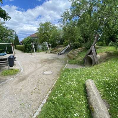 Spielplatz mit vielen spannenden Spielelementen für jedes Alter: Sandfläche, Tunnelröhre, Schaukeln, Rutsche, Balancierbereich und vieles mehr.