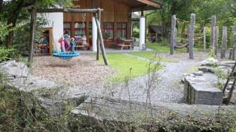 Der von Bäumen umgebene Spielplatz beim Kindergarten in Linthal lädt zum Verweilen ein. Der Spielplatz bietet einem Sandkasten, einer Wasserbahn, einem Vogelnest, einer Rutsche, einem Kletterturm und ein Häuschen.