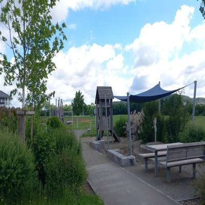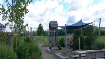 Spielplatz mit vielen spannenden Spielelementen für jedes Alter: Schaukel, Sandbereich, Rutsche, Spielturm und vieles mehr.
