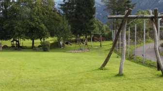 Eine grosszügige Spielanlage, mit Feuerstelle, Wiese und Bäumen