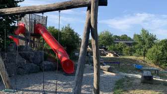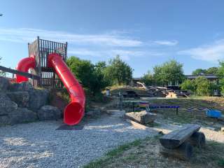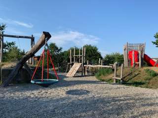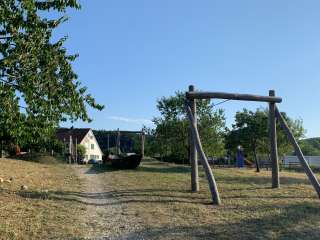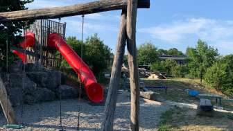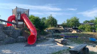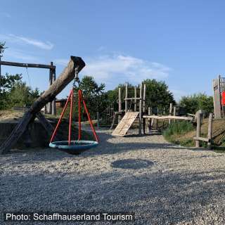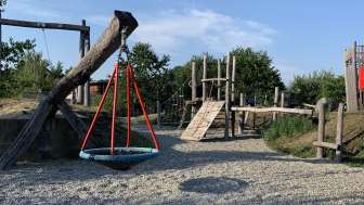 Ein Klettergerüst, eine Rutschbahn, Schaukeln, eine Seilbahn, eine Pumpe mit Wasserlauf und ein alter Holweidling lassen alle Kinderaugen aufleuchten.