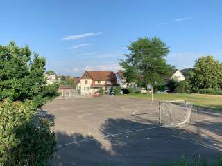 Für die Grösseren hat es einen Hartplatz mit Basketballkorb und Fussballtoren sowie einen Ping Pong Tisch.