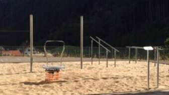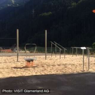 Der Spielplatz beim ehemaligen Schulhausplatz bietet akrobatische Spielgeräte von Kletter- über Reckstangen, eine Federwippe und ein Rodeo Board.
