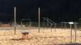 Ein sandiger Spielplatz mit Aussicht in die Berge