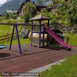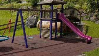 Der Spielplatz bietet ein Vogelnest, eine Schaukel, eine Rutschbahn, Federspielgeräte und einen Spielturm mit Brücke und Tunnel.