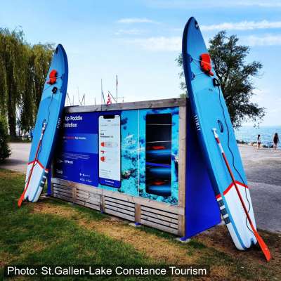 Mit der selbstbedienbaren und vollautomatischen Mietstation für Stand-up-Paddles steht deinem Ausflug auf dem Bodensee nichts mehr im Wege.