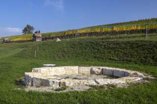 In früheren Zeiten diente das Becken zur Sammlung des Drainagewassers aus den Rebbergen. Heute bietet dieser aus warmem Kalkstein gebaute Platz dem Wanderer einen Moment der Entspannung, der Ruhe, der Stille.