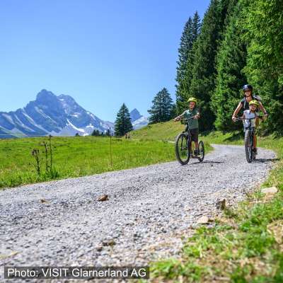 Die 3 km lange Naturstrasse vom Grotzenbüel via Schwettiberg ins Dorf ist ein ideales Terrain zum Trottinett-Fahren. Auf der Abfahrt ist das imposante Bergpanorama ein treuer Begleiter. Garantiert ein Spass für Gross und Klein.