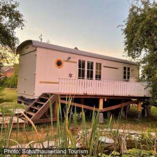 Schlafen Sie im Zirkuswagen mitten im Naturpark Schaffhausen und Blauburgunderland direkt neben dem Biotop unter alten Apfelbäumen. Geniessen Sie ein schönes Ambiente auf der Sonnenterrasse oder veranstalten Sie einen Grillplausch auf dem Grillplatz. Für Kinder gibt es einen Spielplatz zum Austoben.