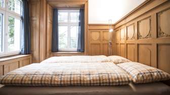 - Ein Lesezimmer ganz aus Arvenholz, in dem auch eine kleine Bibliothek untergebracht ist