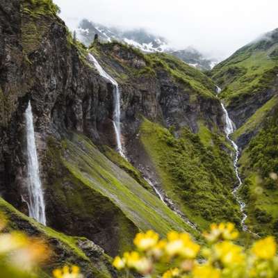 Sie stehen vor dem 81 Meter hohen Piltschinabachfall (links), dem Sässbachfall (86 m hoch, Mitte) und dem Muttenbachfall (45 m hoch, rechts). Etwas weiter oben mündet der Lavtinabach in den Piltschinabach und etwas weiter unter der Guetentalbach in den Gufelbach. Sie befinden sich an einem fünfarmigen Wasser-Kraftort, der zu einer imposanten Felsarena ab-getragen worden ist. Nicht nur der Anblick ist überwältigend, auch die Energien sind äusserst hoch und aufbauend.