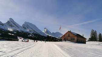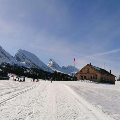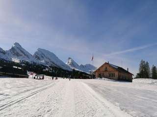 Der im Stil einer modernen Alphütte erbaute Zinggen-Pub liegt direkt an der Piste bei der Ruestel-Talstation und bietet Getränke und Snacks.