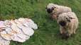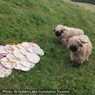 Zwei Schwarznasen, die das Werk aus ihrer Wolle begutachten