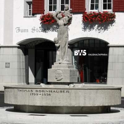 Der Rundgang beginnt am Rathausbrunnen. Die Statue, die den Brunnen schmückt, zeigt eine unbekannte Frau und zwei Knaben, deren Namen wir nicht kennen. Dieses Beispiel zeigt, dass man zwar Frauen als Monumente auf den Sockel stellt, und sie aber gleichzeitig ihres eigenen Namens beraubt.