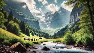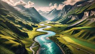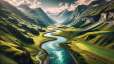 Ein malerischer Fluss der durch die atemberaubenden Landschaften der Schweizer Alpen fliesst.